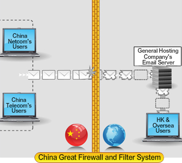 Emails are always blocked by China's great firewall and filter system when sending and receiving emails from and to China.